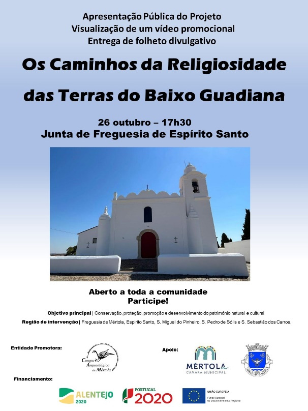 No próximo dia 26 de outubro, pelas 17h30, na Junta de Freguesia de Espírito Santo será apresentado o Projeto "Caminhos da Religiosidade das Terras do Baixo Guadiana", com a exibição de filme sobre a temática, conversa e entrega de materiais de divulgação deste nosso rico património religioso.