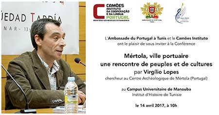 “Dando seguimento ao intercâmbio de investigadores e de conhecimentos nas áreas da história, património e arqueologia, o investigador e historiador do Campo Arqueológico de Mértola, Virgílio Lopes, dará uma conferência, na Universidade de Manouba (Instituto de História da Tunísia), no dia 14 de abril de 2017, às 10h00, sobre o carácter portuário e intercultural de Mértola.