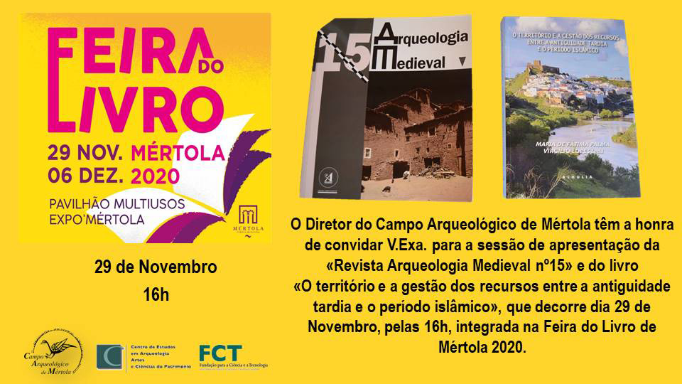 O Diretor do Campo Arqueológico de Mértola tem a honra de convidar para a sessão de apresentação das mais recentes publicações do Campo Arqueológico de Mértola, «Revista Arqueologia Medieval nº15» e o livro «O território e a gestão dos recursos entre a antiguidade tardia e o período islâmico», que decorre dia 29 de Novembro, pelas 16h, integrada na Feira do Livro de Mértola 2020.