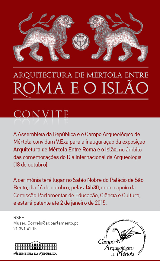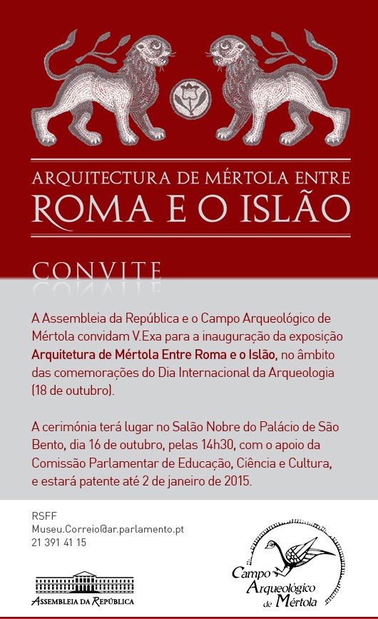 A Assembleia da República e o Campo Arqueológico de Mértola convidam V.Exa para a inauguração da Exposição «Arquitectura de Mértola Entre Roma e o Islão», no âmbito das comemorações do Dia Internacional da Arqueologia (18 de outubro).