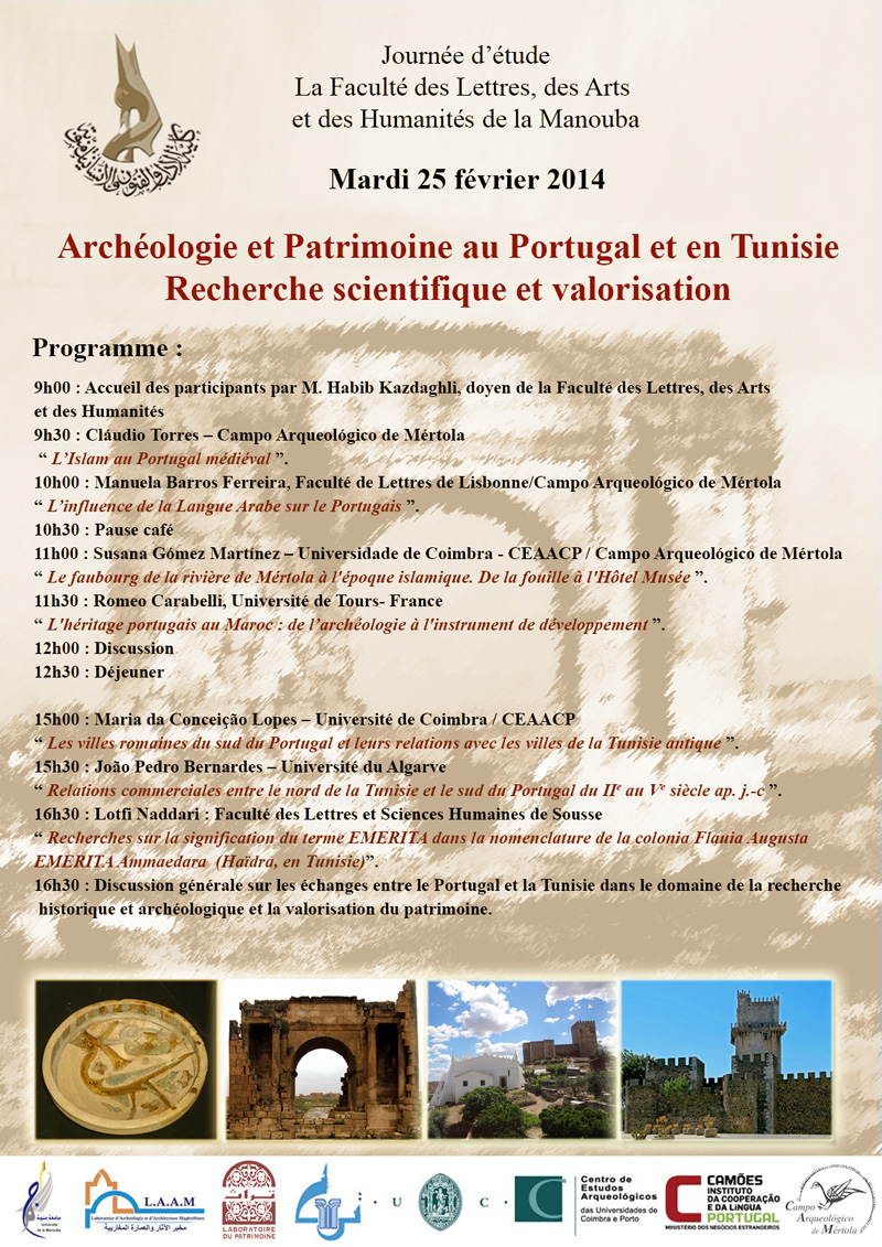 No próximo dia 25 de Fevereiro de 2014, na Faculdade de Letras, de Artes e de Humanidades de Manouba–Tunísia, decorrerá as Jornadas de Estudos Arqueologia e Património em Portugal e na Tunisia – Investigação Científica e valorização.