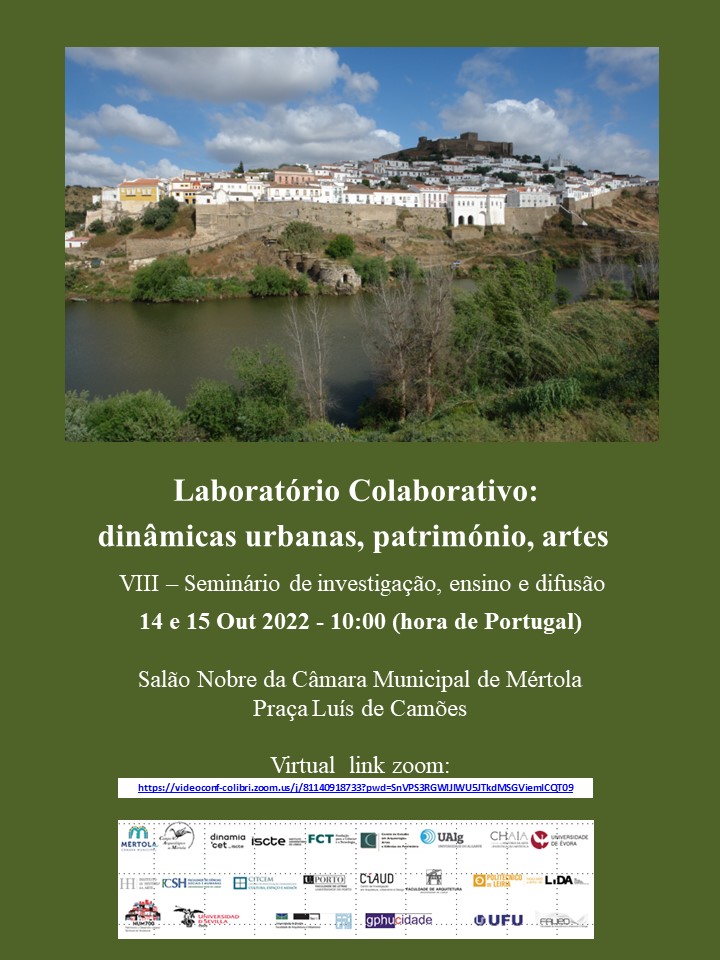 Numa organização de várias entidades, Mértola recebe, através do Campo Arqueológico e da Câmara Municipal o Laboratório Colaborativo: Dinâmicas Urbanas, Património, Artes. VIII Seminário de Investigação, Ensino e Difusão, nos dias 14 e 15 de outubro de 2022 – 10h (hora de Portugal), no Salão Nobre da Câmara municipal de Mértola, na Praça Luís de Camões.