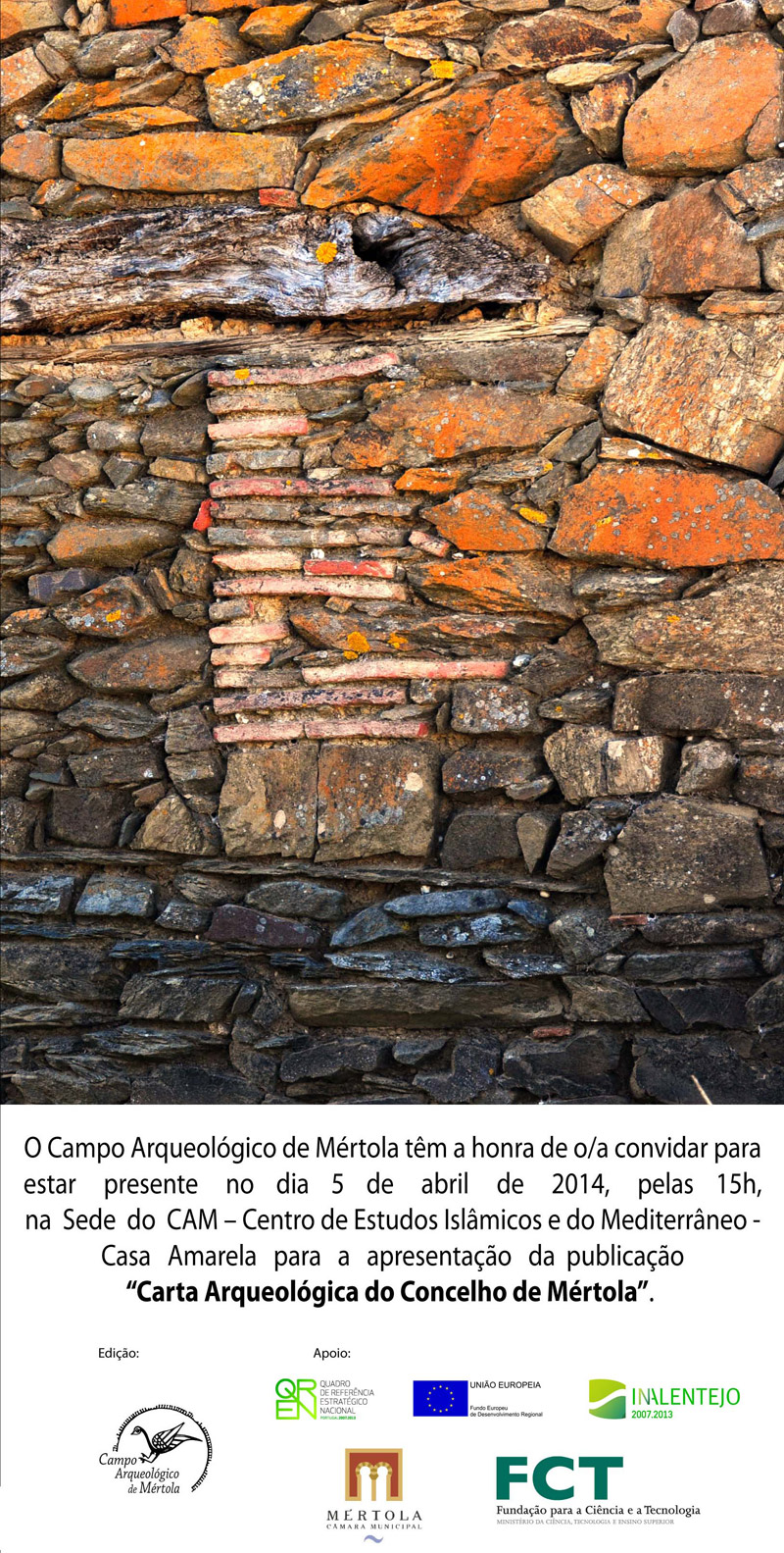 O Campo Arqueológico de Mértola têm a honra de o/a convidar para o Lançamento da Publicação da Carta Arqueológica do Concelho de Mértola, no dia 05 de Abril, pelas 15h, na Sede do CAM - Centro de Estudos Islâmicos e do Mediterrâneo – Casa Amarela.