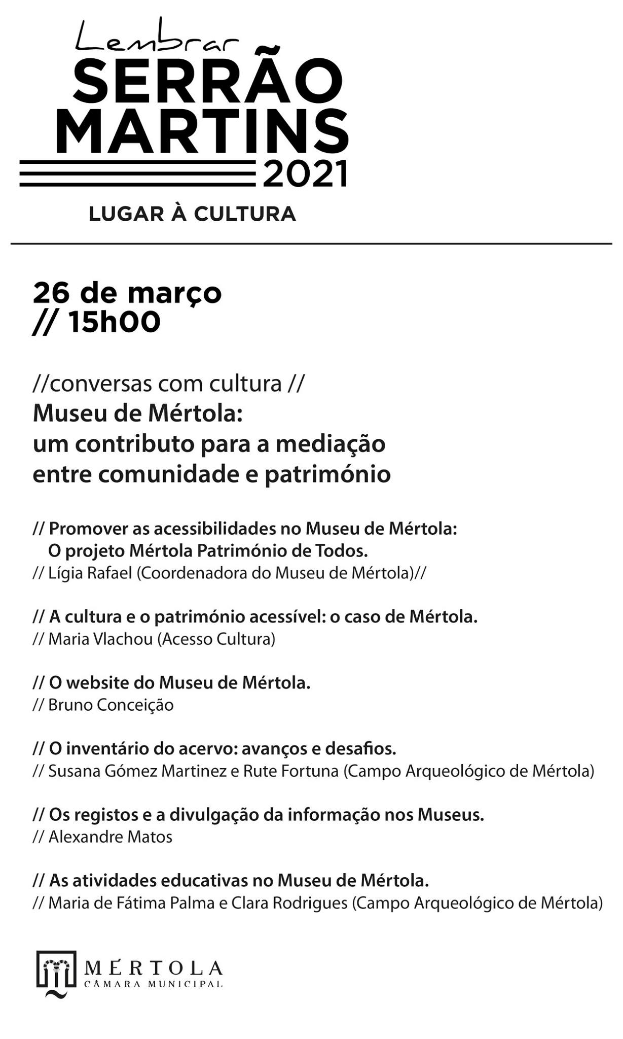 A propósito da divulgação do novo site do Museu de Mértola, a Câmara Municipal promove uma conversa para apresentar as suas diferentes funcionalidades e salientar o papel do Museu na mediação entre património, ciência e comunidade. O CAM estará presente com duas intervenções: