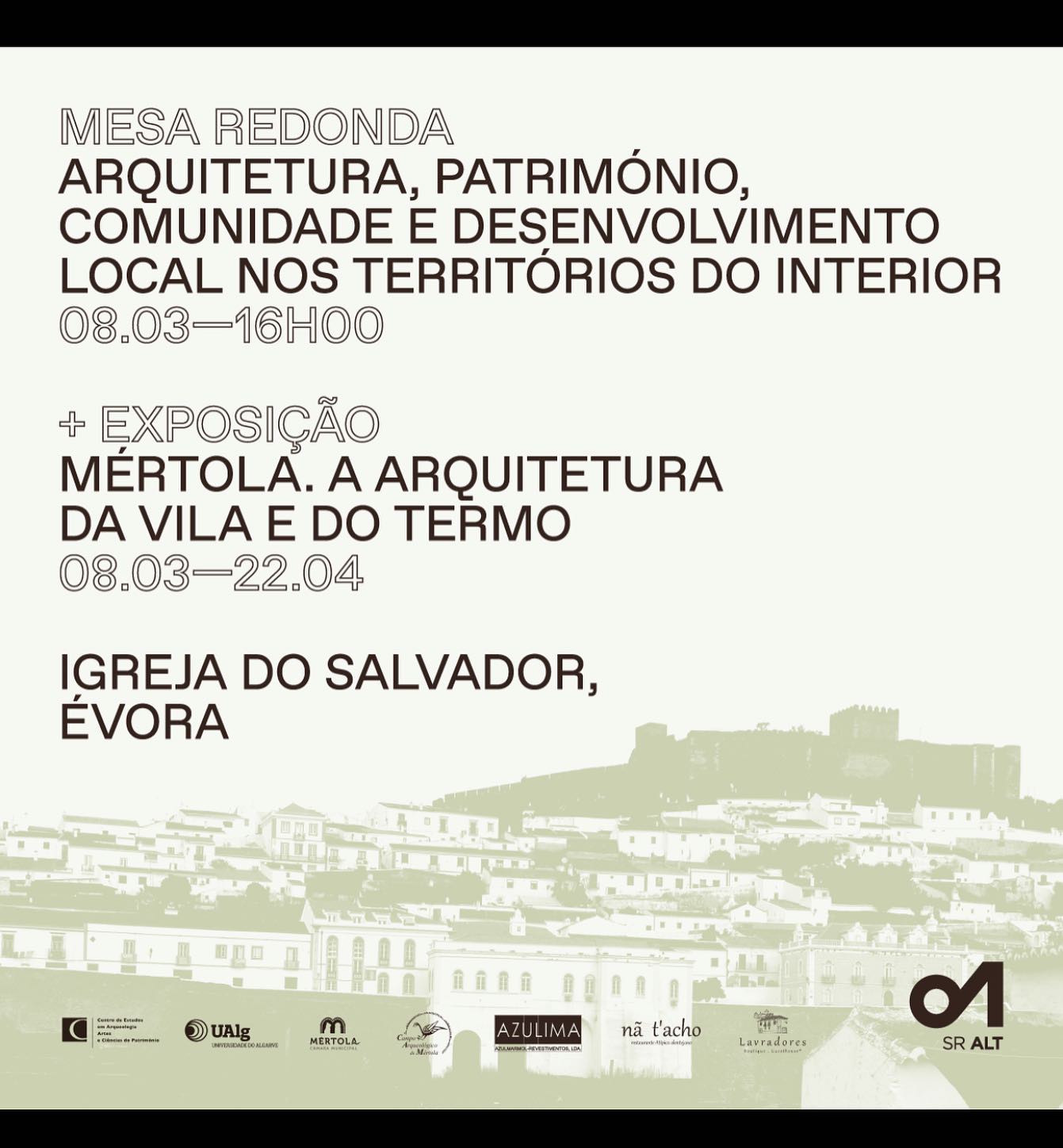 Mesa Redonda “Arquitetura, Património, Comunidade e Desenvolvimento local nos territórios do interior” e Inauguração da Exposição “Mértola. A Arquitetura da Vila e do Termo”, que terá lugar no dia 8 de março às 16h, na Igreja do Salvador, Évora - junto à sede da Secção Regional do Alentejo da Ordem dos Arquitetos.