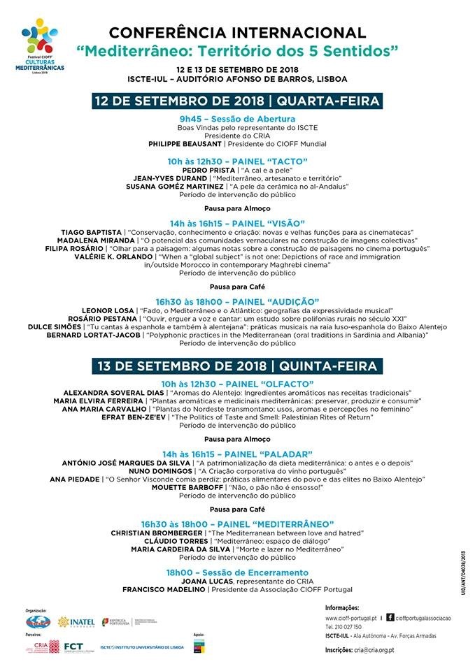 “Espaço de encontro de especialistas e personalidades da cultura para debate sobre o presente e o futuro no mediterrâneo. A cultura como promotor da Paz. Uma Conferência Internacional sobre a temática das culturas mediterrânicas será realizada nos dias 12 e 13 de setembro de 2018, marcando a abertura solene do Festival CIOFF® de Culturas Mediterrânicas.