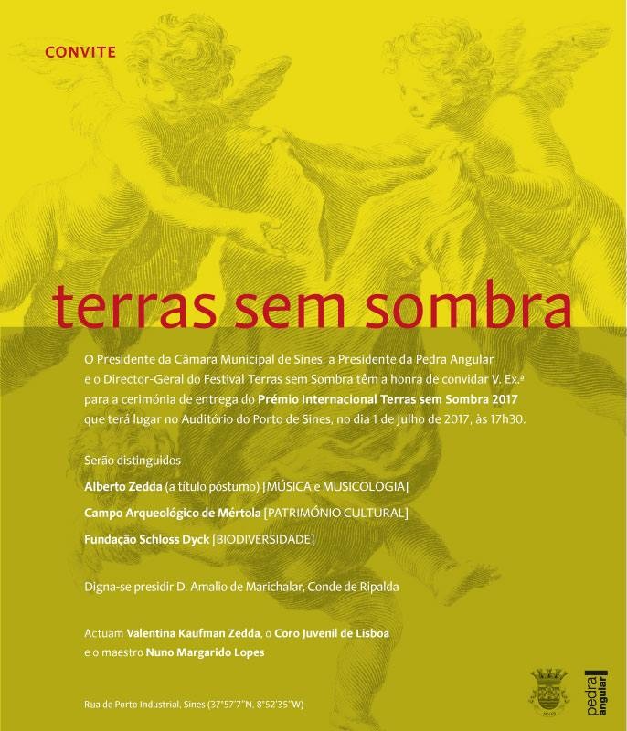 A cerimónia de entrega do Prémio Internacional Terras sem Sombra 2017 terá lugar no Auditório do Porto de Sines já no próximo sábado, pelas 17h30. Actuam Valentina Kaufman Zedda, o Coro Juvenil de Lisboa e o maestro Nuno Margarido Lopes.