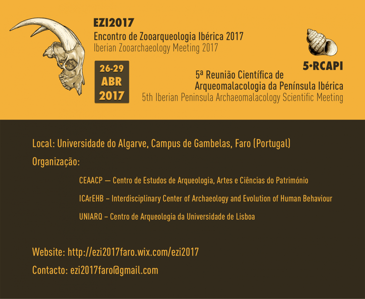 “Encontram-se abertas as inscrições para o primeiro Encontro de Zooarqueologia Ibérica (EZI2017) e a 5ª edição da Reunião Científica de Arqueomalacologia Ibérica (5RCAPI). Estes dois encontros científicos, realizados em associação, são organizados por três Unidade de I&D: o CEAACP, o ICArEHB e a UNIARQ.