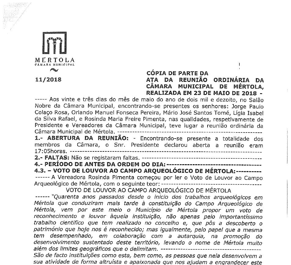 Voto de Louvor - C.M. Mértola ao CAM 14, junho 2018 Voto de Louvor concedido pela Câmara Municipal de Mértola ao Campo Arqueológico de Mértola, durante a Sessão Inaugural das Comemorações dos 40 anos do CAM. Ver PDF Termos relacionados: Notícias
