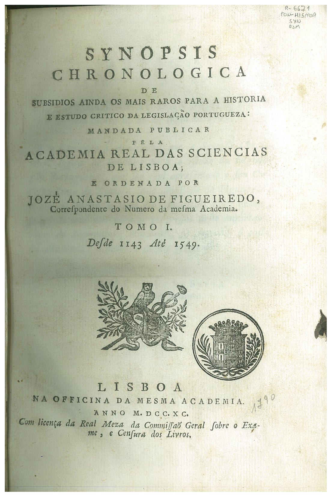 FIGUEIREDO, José Anastácio (compil.) - Synopsis chronologica de subsidios ainda os mais raros para a historia e estudo critico da legislação portugueza. Lisboa : na officina da mesma Academia, 1790. 2 vols.