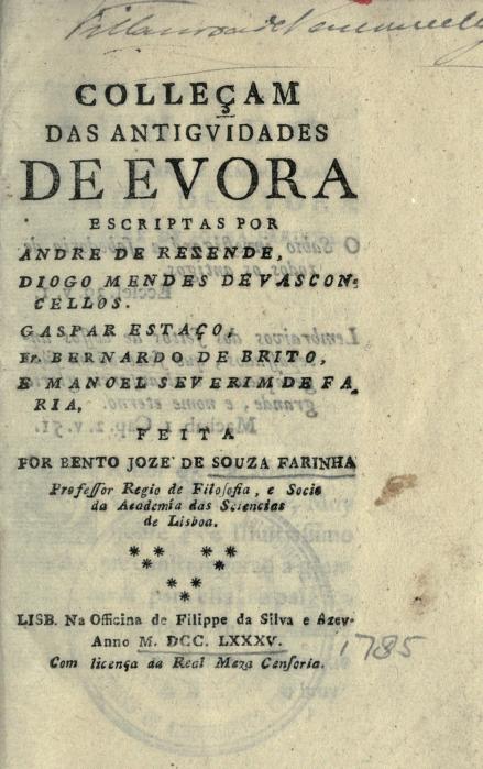 FARINHA, Bento José de Sousa (compil.) - Colleçam das antiguidades de Evora escriptas por Andre de Rezende, Diogo Mendes de Vasconcellos, Gaspar Estaço, Fr. Bernardo de Brito, e Manoel Severim de Faria. Lisb. [Lisboa] : na officina de Filippe da Silva e Azev., 1785. 180 p.