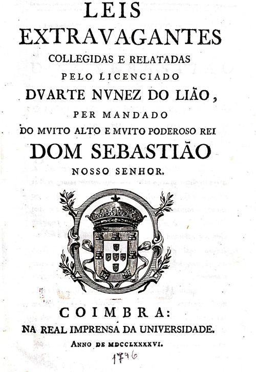 Leis extravagantes / collegidas e relatadas pelo licenciado Duarte Nunez do Lião. - Coimbra: na Real Imprensa da Universidade, 1796. - [XIV], 880 p. ; 22 cm. - (Collecçaõ da legislaçaõ antiga e moderna do Reino de Portugal, Parte 1 : Da legislação antiga)