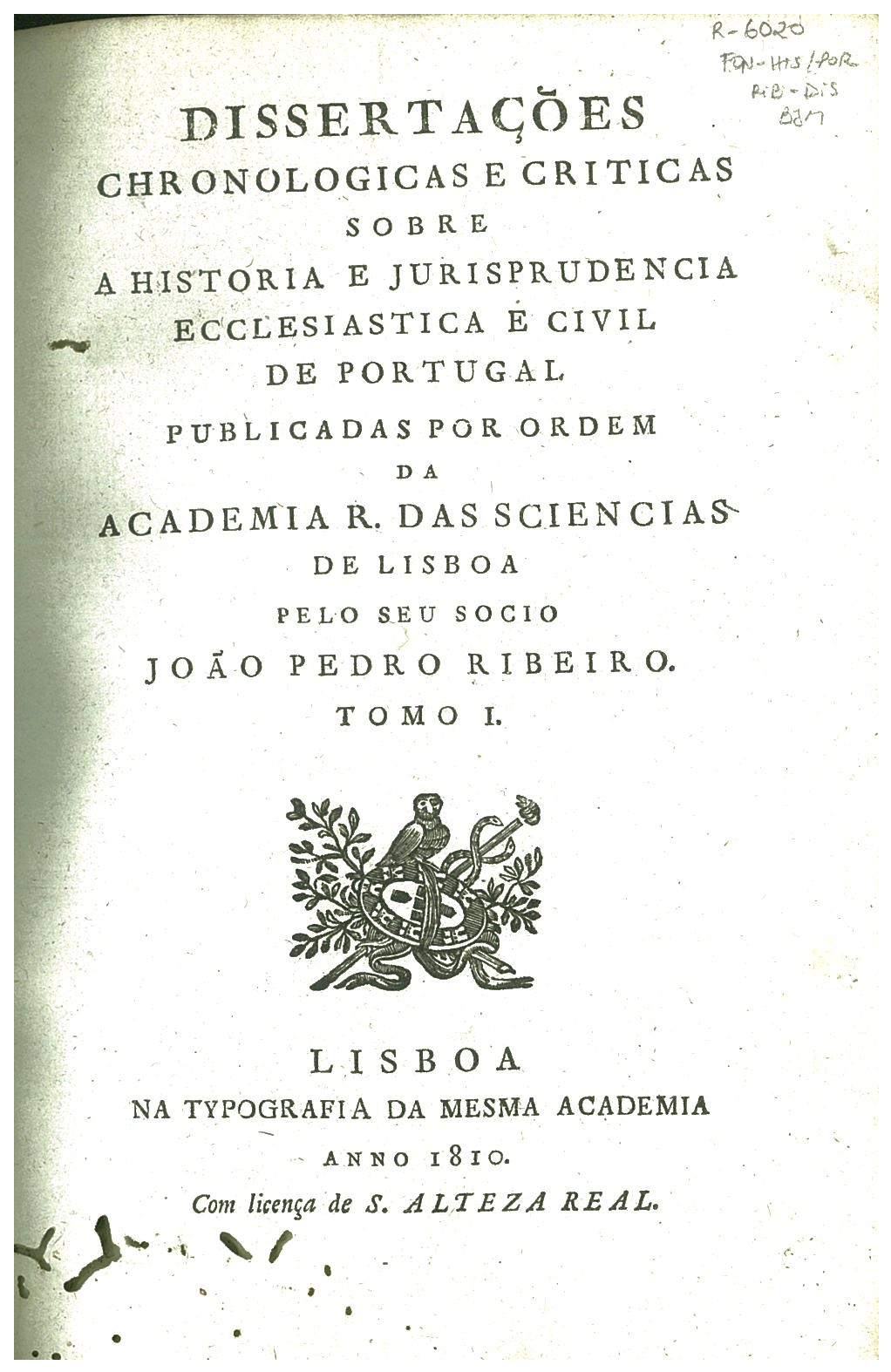 «No último quartel do século [XVIII], institucionalizou-se, debaixo da influência de D. Fr. Manuel do Cenáculo, o cargo de professor de Paleografia (1772) e, em 1775, da cadeira de Ortografia Diplomática. É dentro deste contexto que vemos a Academia Real das Sciencias de Lisboa incentivar um processo de inventariação e recolha documental junto dos arquivos portugueses, particularmente os religiosos, destacando-se o nome de Dr. João Pedro Ribeiro [entre outros]. […] Enquanto autor, João Pedro Ribeiro (fl839) é considerado o mais alto expoente da idade de ouro da Diplomática portuguesa, publicando duas obras cimeiras, as Observações históricas e criticas para servirem de memorias ao systema da Diplomática Portugueza (1798) e as Dissertações Chronologicas e Criticas sobre a Historia e Jurisprudência Ecclesiastica e Civil de Portugal, em cinco volumes (1810 a 1836)», obra que destacamos este mês da Biblioteca particular de José Mattoso. [GOMES, Saul: 1998]